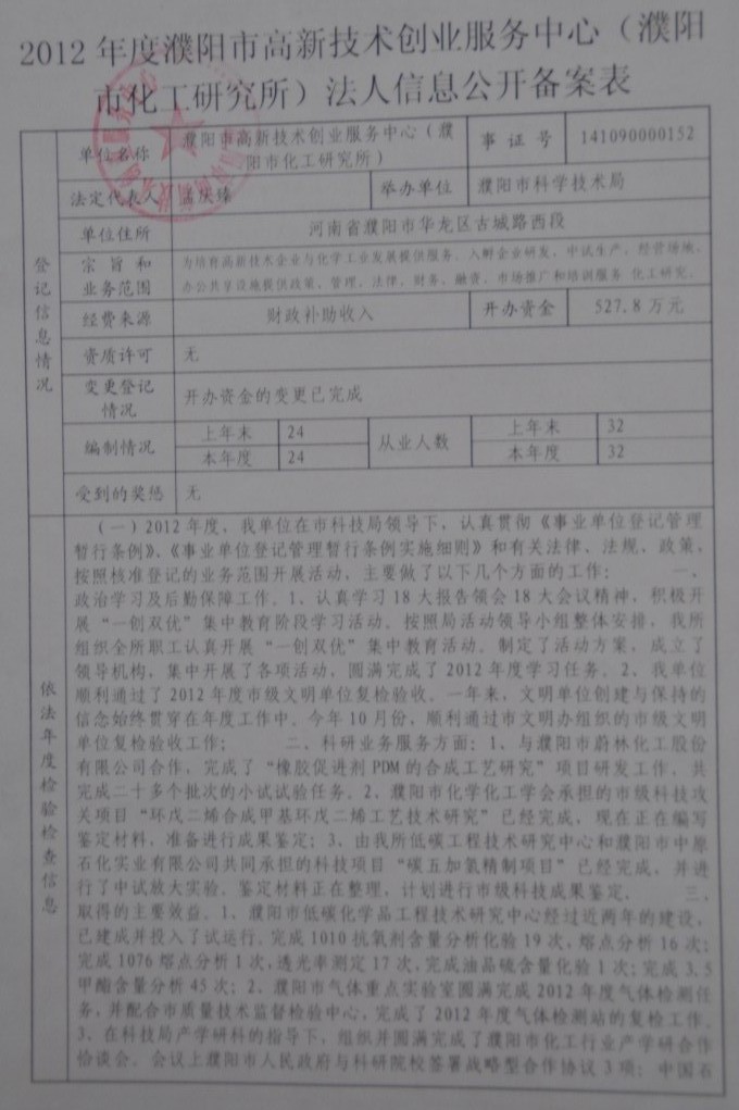 濮阳市高新技术服务创业中心( 濮阳市化工研究所)法人信息公开备案表