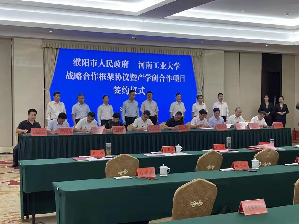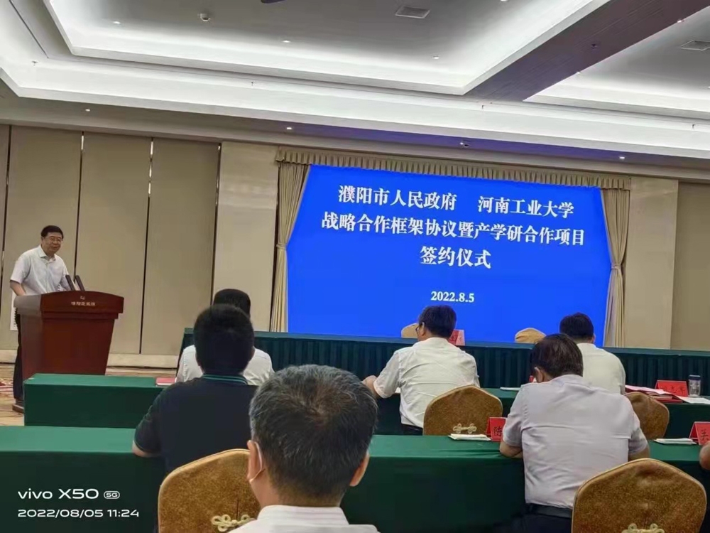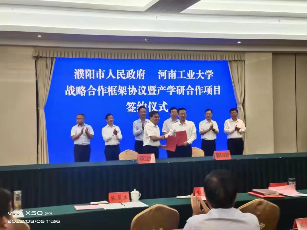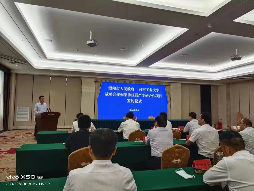 8月5日上午,濮阳市人民政府-河南工业大学战略合作框架协议暨产学研合作项目签约仪式在濮阳迎宾馆举行。