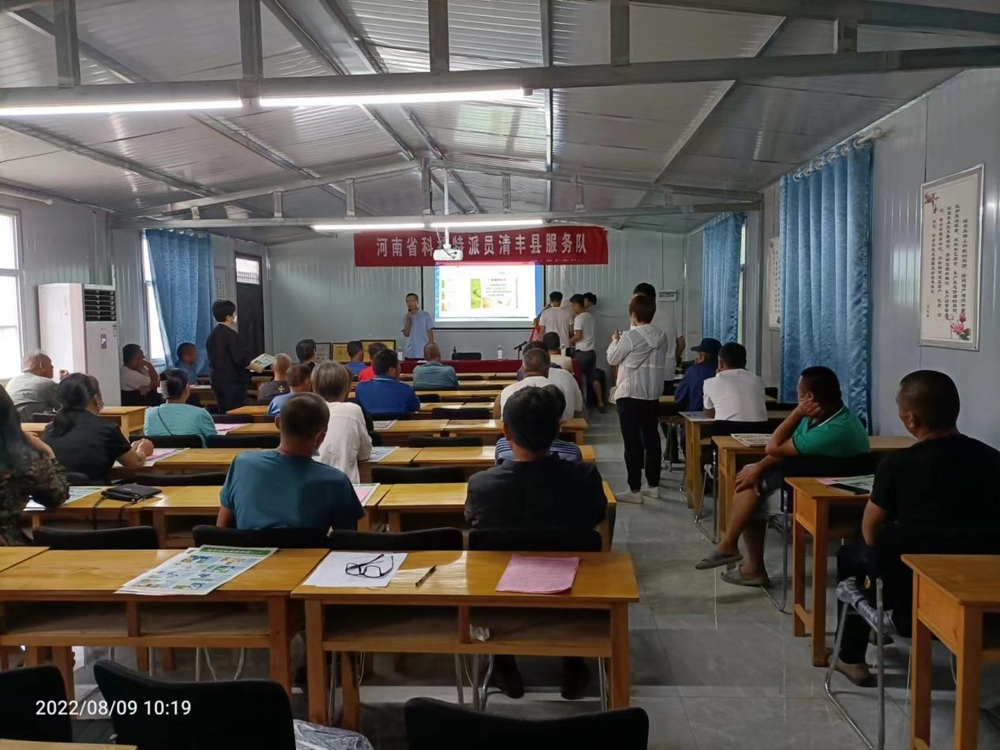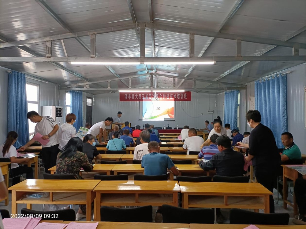 2022年8月9日,在清丰县工信局副局长翟润丽同志带领下,清丰县科技特派员肖占伟和清丰县工信局工作人员一行5人到清丰县顺丰种植农民专业合作社举办大豆玉米带状复合种植技术培训班。参加培训的人员有合作社社员及大豆玉米带状复合种植户,共计30余人。通过采取现场互动的方式,根据当前大豆玉米带状复合种植田间长势,有针对性的进行技术培训。培训现场气氛热烈,社员和种植户积极参与,现场接受社员咨询并给予解答,取得了良好的培训效果。会后来到顺丰种植合作社大豆玉米带状复合种植示范田进行现场指导,力争实现“玉米不减产,增收一季豆”的产量目标,为合作社增产增收提供技术支撑,为乡村振兴注入科技活力。现场发放技术手册以及玉米、小麦、大豆玉米带状复合种植等各类技术资料共计200余份。