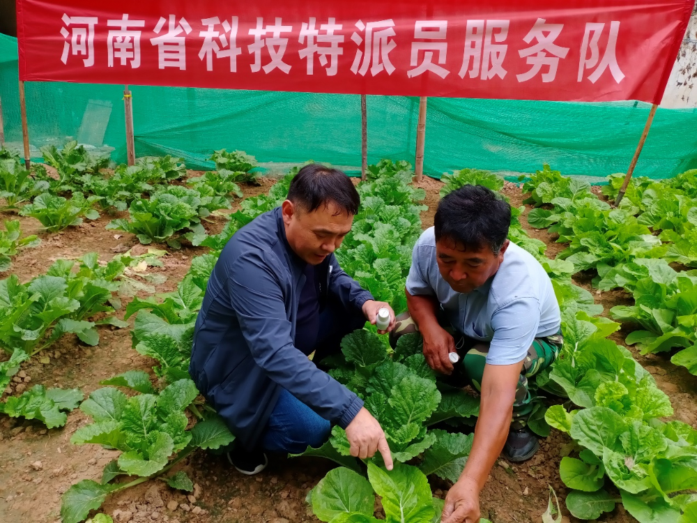 在南辛庄村家庭农场种植的大白菜田间,岳振平向农场负责人交流了秋大白菜种植注意事项,就大白菜常发生的霜霉病、软腐病进行了重点讲解。大白菜霜霉病是真菌性病害,以叶片发病为主,初期叶片有小斑点,逐渐变为黄褐色,叶片背面对应病斑位置会长出白色霉层,主要防治药剂有氟菌·霜霉威、霜脲锰锌等;大白菜软腐病是细菌性病害,俗称"烂疙瘩"、“烂帮子”,严重时全株腐烂,病部散发出恶臭味,病叶失水变干后平贴地面或紧贴叶球,主要防治药剂有恶霜嘧铜菌、噻菌铜等。针对大白菜受附近杨树上的毛毛虫危害的情况,岳振平赠送了虱螨脲农药,并仔细交代了使用的注意事项。岳振平还向农场负责人了解了秋收秋种存在的问题和需求,以便下一步有针对性地提供技术服务。