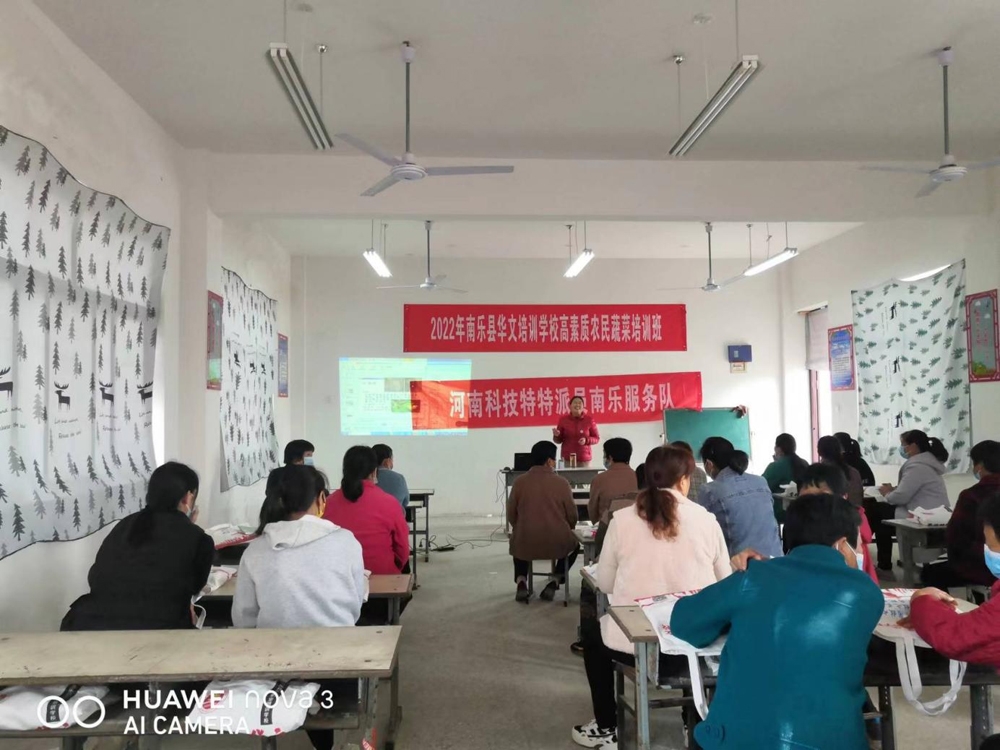 2022年10月30日,河南省科技特派员、南乐县农业农村局高级农艺师马振玲在南乐县张果屯镇张行村小学教室内举办蔬菜技术培训班。