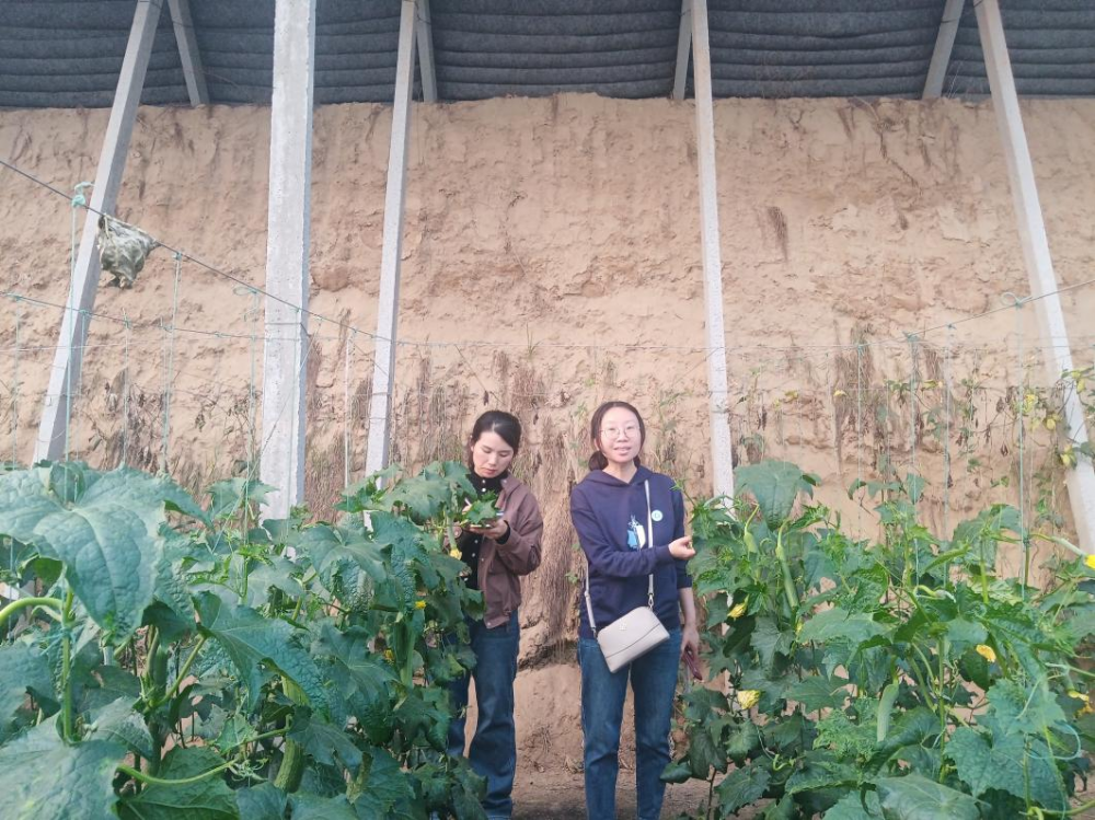 白堽乡寺上村李世录的大棚里特派员服务团成员指导丝瓜苗期管理技术,传授丝瓜吊蔓、留瓜、整枝技术。