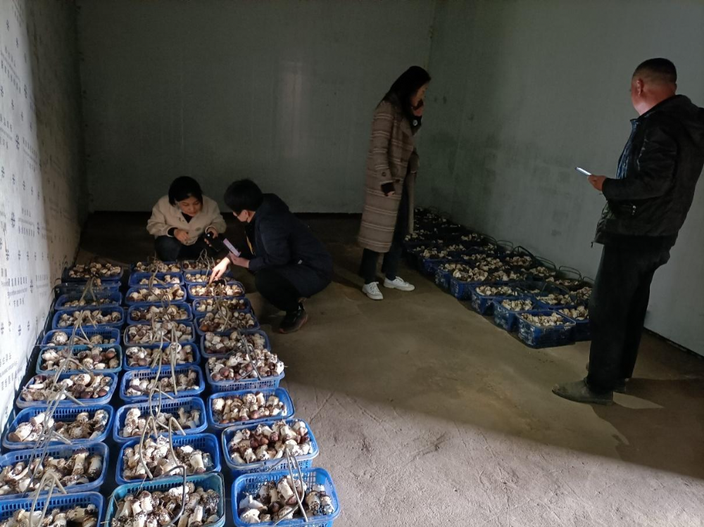随后,科技特派员又到冷库查看了一下鲜品采收规格,看到满地摆放的鲜品,科技特派员又是喜、又是忧。喜的是当下行情不错,农户能买个好价格,忧的是采摘下的鲜品虽然放到了冷库,但并未打冷、分级,而且农户现在还苦无销路。大球盖菇常温下菌盖很容易开伞,菌柄也会变木质化。面对此种情况,科技特派员现场为农户联系几家干新品统收的收购商,并将联系方式给农户留下,方便自由洽谈。同时告诉农户产品包装纸、箱等材料购买地,再三叮嘱,不同的收购商对大球盖菇的产品等级、包装规格、运输条件等要求不同,一定要提前与商家协商一致,按对方需求进行包装出售,最好要求对方提前支付一半或全部货款。