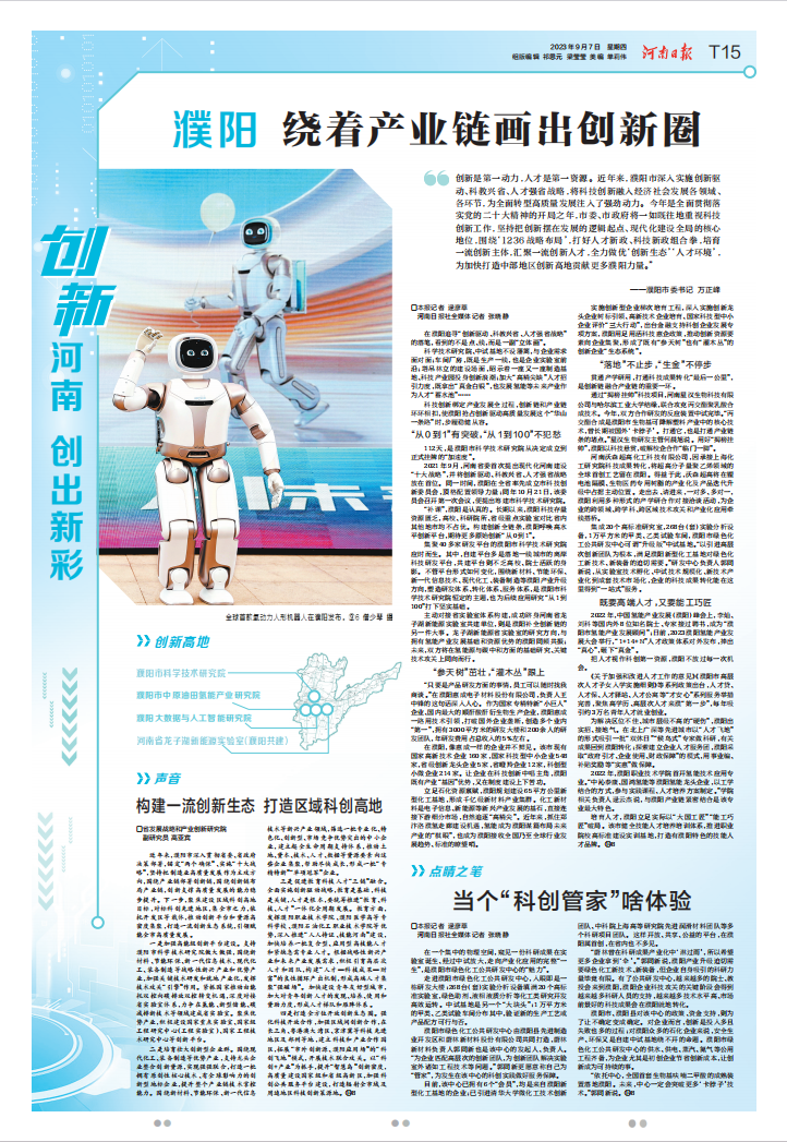 今天的《河南日报》,以整版篇幅报道了深入实施创新驱动、科教兴省、人才强省战略的濮阳实践。