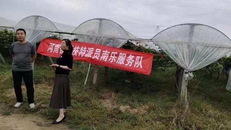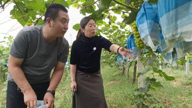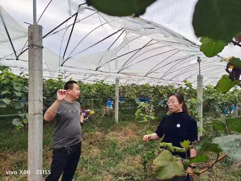 9月23日,南乐县科技特派员张丽景深入元村镇葡香园葡萄种植合作社指导葡萄管理。主要讲解了葡萄疏果、套袋及采摘后的管理技术。一是疏粒。为保证阳光玫瑰的果实品质和果穗整齐度以及增加果实商品性,在套袋前,对所留果穗进行一次全面的疏粒工作。要去除病虫果粒、畸形果粒、无核果粒和着生紧密的内膛果粒,疏果后要使果穗上果粒分布均匀、松紧适度,果穗大小基本一致。二是套袋。果实套袋可以减少鸟类危害和病虫害、减少农药使用量和环境污染、延迟采收、提高果实的商品性。一般在花后30~40天为宜。套袋应在晴天进行,以上午8~10时或下午4时以后为宜,切忌雨后高温立即套袋。三是采摘。最上面最先成熟,最下面的最晚成熟,如果下面一颗成熟了,上面的肯定就没问题了。一看、二捏、三闻,一看:看果穗的饱满度;二捏:用手轻轻捏一下,弹性很好,证明葡萄是脆的;三闻:轻轻地闻一下有玫瑰的清香味,证明葡萄成熟了,可以采摘。四是施肥。在果实采摘之后,需加施复合肥料,剂量为15公斤/亩,并喷洒磷酸二氢钾,浓度为0.3%。需在植株周围挖出深度为40cm、宽度为50cm的施肥沟,施入基肥后盖上表土,浇透水。