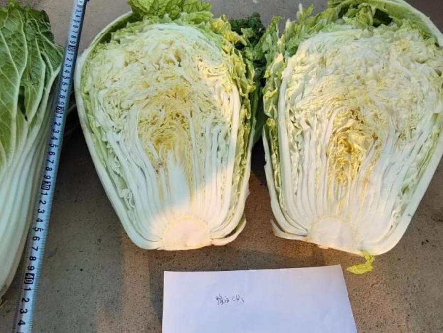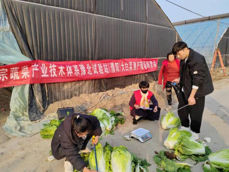 豫白CR3和豫新4号大白菜是省农科院在濮阳重点推广及应用的大白菜品种,品种具有高产、抗病、优质的特点,深受广大消费者的喜爱。本次测产采取五点随机取样的方法,测产显示,豫白CR3行距68㎝,株距45㎝,折合2144株/亩,平均单株毛菜重量5㎏,净菜3.5㎏,折合亩产量10000㎏/亩,净菜7571㎏/亩,净菜率75%。豫新4号,平均行距68cm,株距42cm,折合2358株/亩。单株毛菜重3.2㎏,净菜2.4㎏,折合亩产量毛菜:7449㎏/亩,净菜:5664㎏/亩,净菜率76%。