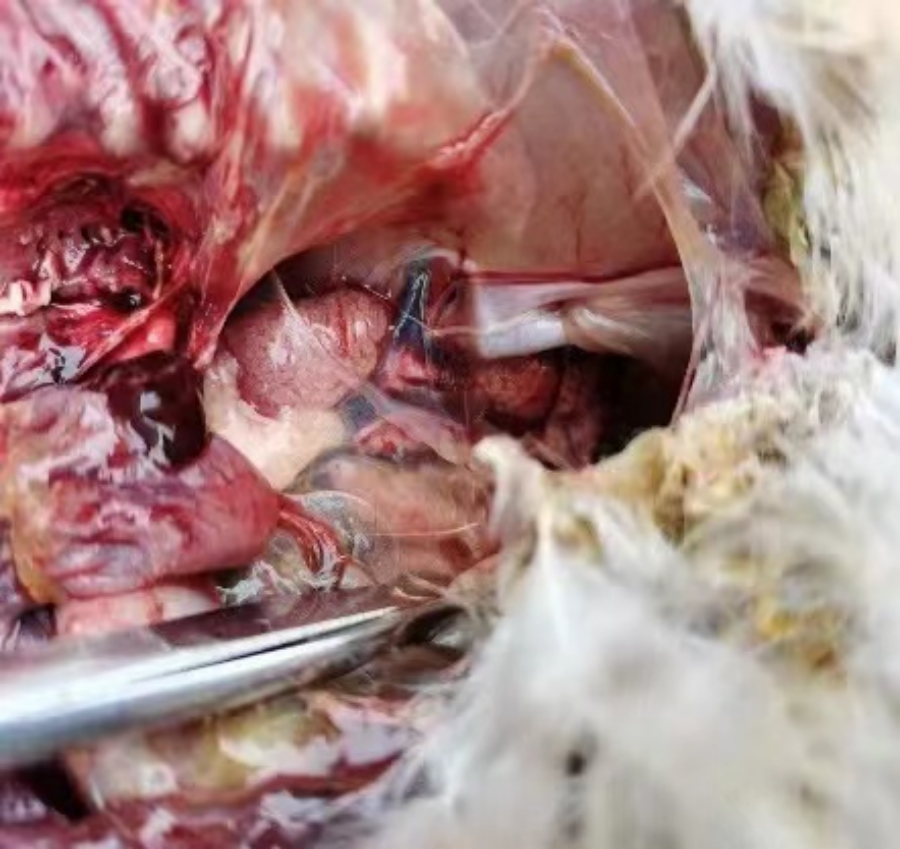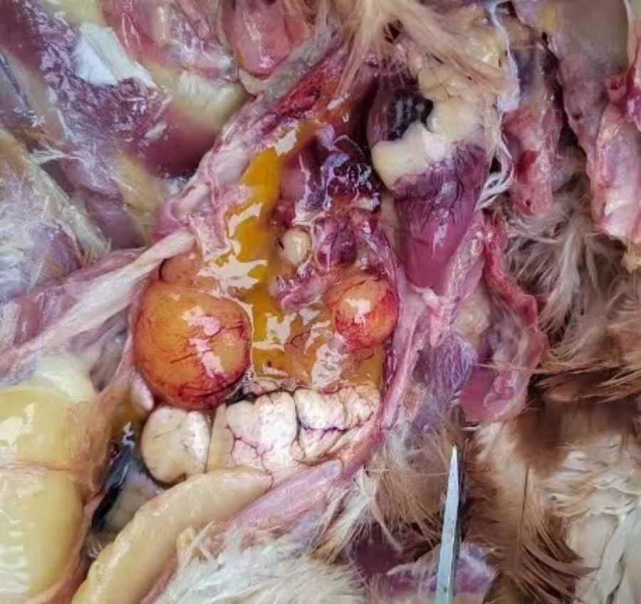 经现场查看、解剖、采样实验室检测及与养殖户了解沟通,发现该鸡群感染了鸡沙门氏菌病。临床表现为病雏鸡精神委顿,缩头颈,闭眼昏睡,绒毛松乱,初期病鸡仅表现食欲减少,继而不食;腹泻,排白色稀浆样粪便,有糊堵肛门现象;病理表现为患病雏鸡肝脾肿大,胆囊扩张,充满胆汁。心、肺以及肌胃、盲肠有灰白色结节。卵黄吸收不良,呈皱缩。患病母鸡卵泡变形,变质,有的卵泡膜出血,有的卵黄液化。