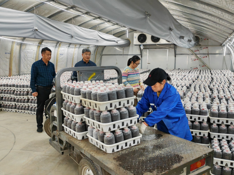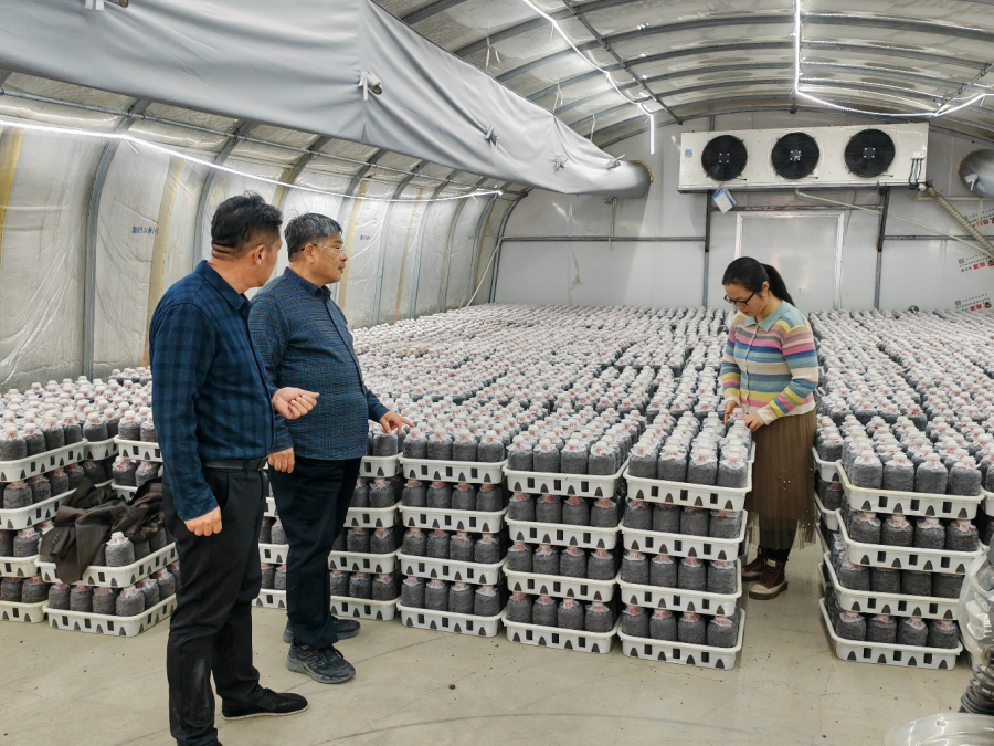 在清丰县马庄桥镇赵家食用菌基地,陈建芳、阎淑滑、赵玉甫一行实地查看了茶树菇接种、发菌情况。赵家食用菌基地茶树菇栽培采用塑料袋培养,层架单头直立摆放的出菇方式进行周年生产。部分大棚正处于养菌的关键时期。