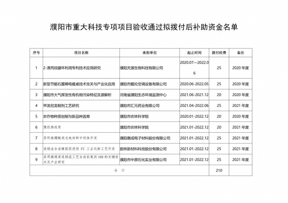 近日,市科技局组织相关领域专家,会同市财政局和市纪委监委派驻纪检组通过听取报告、查阅资料、现场质询、实地考察等方式,对2020年和2021年濮阳市重大科技专项的第一批项目进行验收考核。9个通过验收的项目将获得财政后续资金支持,总金额达210万元。