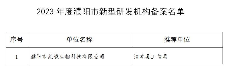 为加快推进我市新型研发机构建设,根据《濮阳市新型研发机构备案和绩效评价办法(试行)》(濮科〔2019〕65号)有关规定,经单位申报、主管部门推荐、专家评审、局领导班子研究、公示等程序,现将2023年度濮阳市新型研发机构备案名单予以公布。