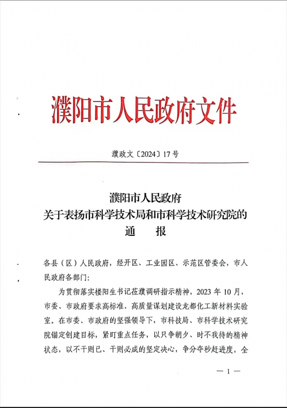 2月26日,濮阳市政府下发《关于表扬市科学技术局和市科学技术研究院的通报》,对市科技局“龙都化工新材料实验室”建设工作提出通报表扬。