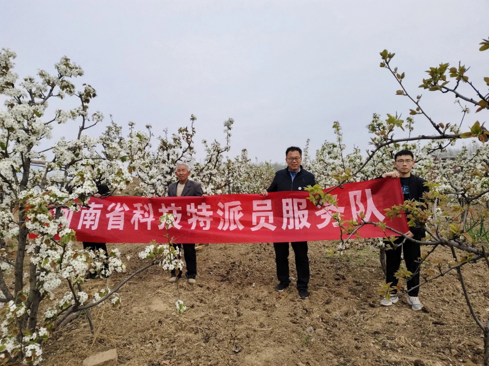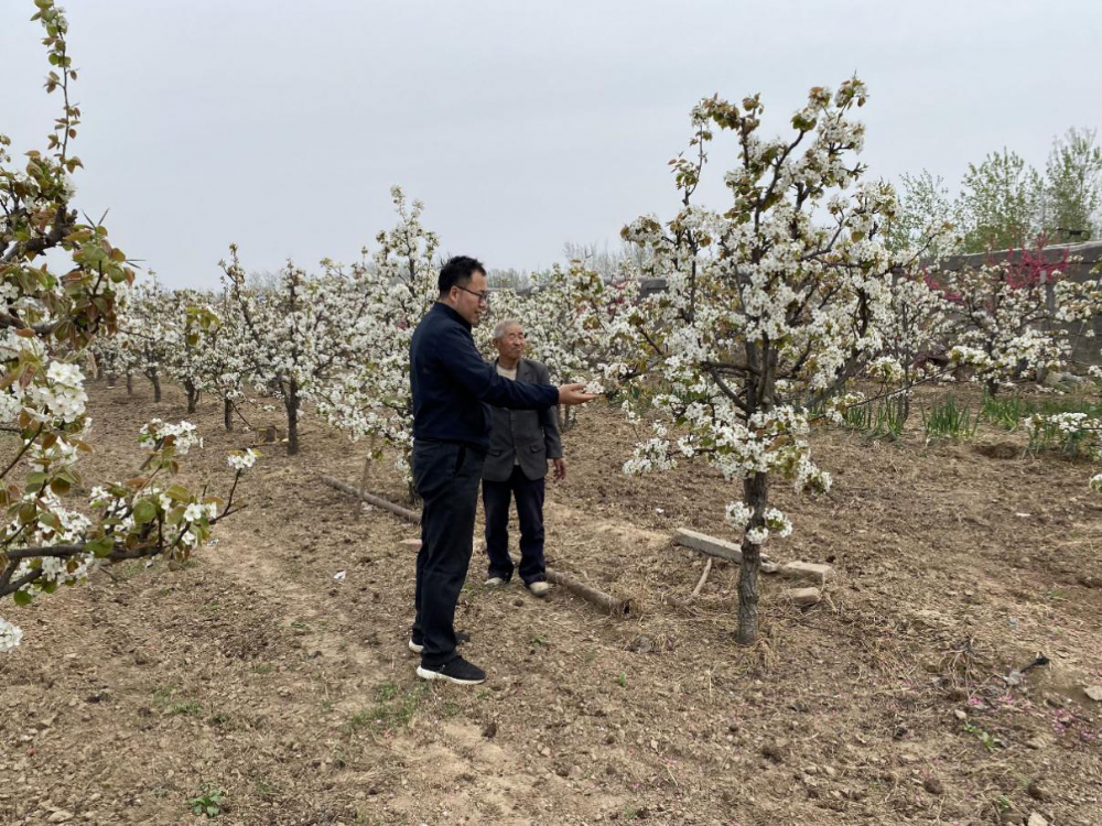 接着程彦伟及团队又到基地果园进行了指导,果园的梨树和桃树正在鲜花盛开,预示着好的收成。这个时候重点工作是土肥水管理、树体管理、病虫害防治等。第一,肥水管理。花后追肥,要以速效性氮肥为主,采用穴施法。第二,树体管理。主要包括拉枝、花期授粉、疏花疏果等。第三,病虫害防治。梨树上发生的病虫害主要有黑星病、蚜虫、梨茎蜂、介壳虫和梨小食心虫等,要及时喷药防治。为了基地生产有序进行,科技特派员将会继续跟踪服务,积极解决农户困难。