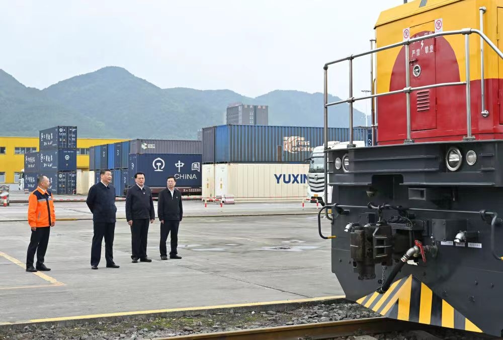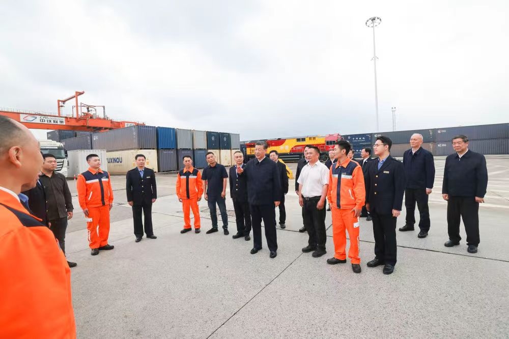 422日至24日,中共中央总书记、国家主席、中央军委主席习近平在重庆考察。这是22日下午,习近平在重庆国际物流枢纽园区重庆铁路集装箱中心站考察。新华社记者 岳月伟 摄