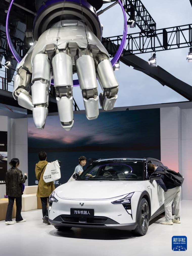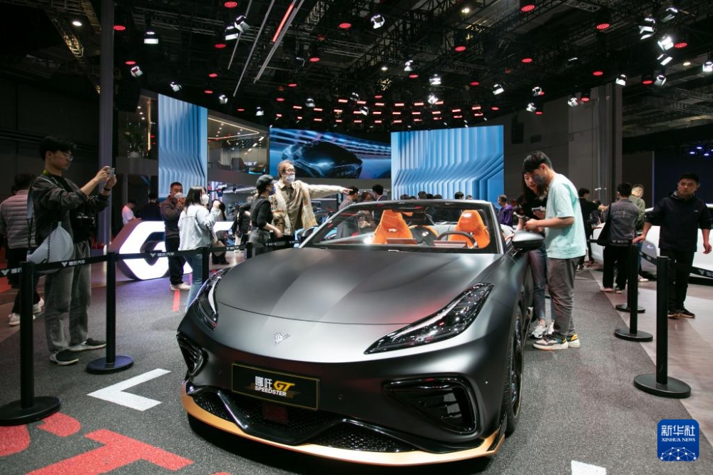 在2023上海车展上,参观者在哪吒GT展车边驻足观看(2023年4月25日摄)。新华社记者 王翔 摄