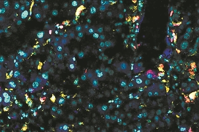衰老小鼠肝细胞表达β-半乳糖苷酶(白色)和uPAR(黄色)。