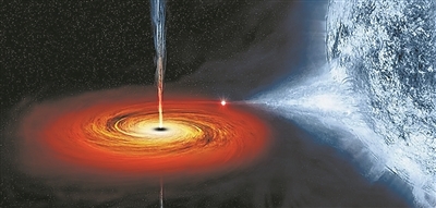 一个黑洞拉拽伴星的物质,形成一个围绕黑洞旋转的物质圆盘,并最终落入黑洞(艺术想象图)。