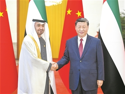 习近平指出,阿联酋是中国重要的全面战略伙伴。近年来,在我们共同引领下,中阿关系保持良好发展势头,树立了新时期中国和阿拉伯国家关系的典范。今年是中阿两国建交40周年,是中阿关系承上启下、继往开来的重要节点。中方愿同阿方一道,继续从战略高度和长远角度牢牢把握两国关系大方向,确保中阿全面战略伙伴关系始终蓬勃发展。