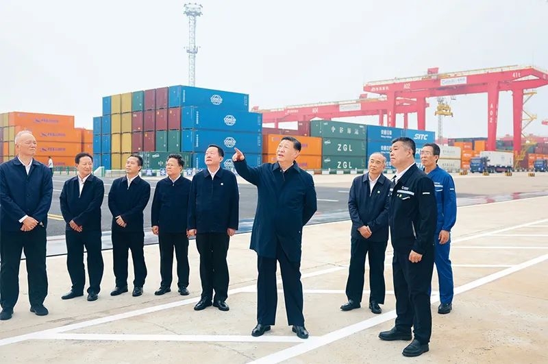 2024522日至24日,中共中央总书记、国家主席、中央军委主席习近平在山东考察。这是22日下午,习近平在日照港察看全自动化集装箱码头作业场景。新华社记者 鞠鹏/