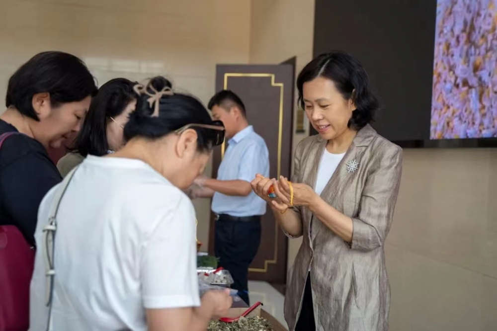 随后,大家纷纷拿起桌上事先准备好的香囊制作材料,在香包里面放上自己喜欢的药材,然后一个个造型可爱、精巧的香包就完成了。端午做香囊不仅是一种传统习俗,也寄托了人们对美好生活的向往和追求,通过佩戴香囊,人们希望能够辟邪驱瘟、祈福纳祥以及增添生活的美好品质与高雅情趣。