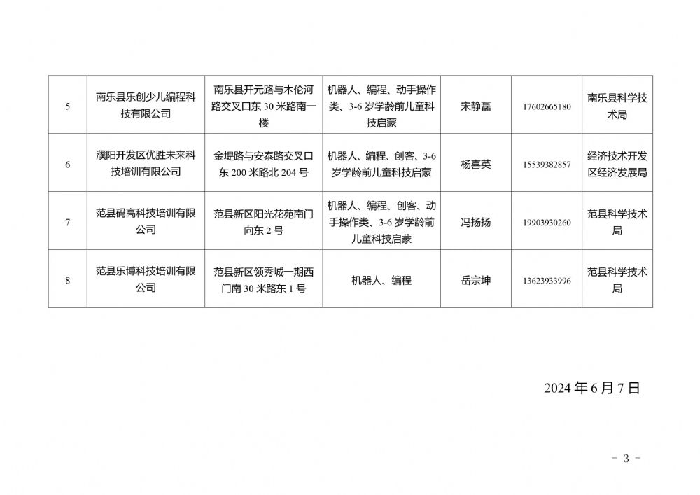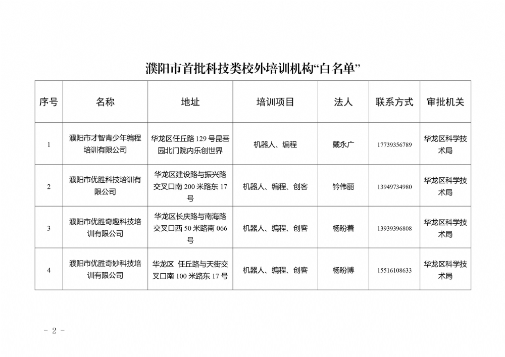 为严格落实国家、省“双减”政策,进一步加强科技类校外培训机构规范化管理,经各科技类校外培训机构自主申报、所属县(区)科技主管部门审核同意,截至目前,我市已有8家科技类校外培训机构取得了线下培训办学资质,现将首批科技类校外培训机构“白名单”公布如下:
