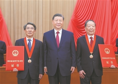 六月二十四日,全国科技大会、国家科学技术奖励大会和中国科学院第二十一次院士大会、中国工程院第十七次院士大会在北京人民大会堂隆重召开。中共中央总书记、国家主席、中央军委主席习近平向获得二○二三年度国家最高科学技术奖的武汉大学李德仁院士(右)和清华大学薛其坤院士(左)颁奖。新华社记者 鞠鹏摄