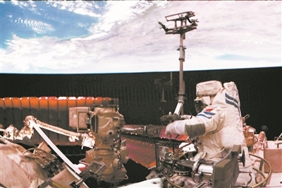 73日在北京航天飞行控制中心拍摄的神舟十八号航天员李聪在空间站组合体舱外作业的画面。新华社记者 郭中正摄