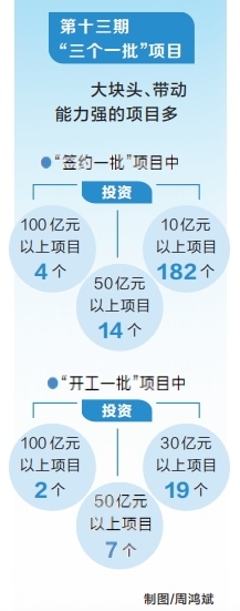 分析第十三期三个一批项目,从投资额度看,大块头、带动能力强的项目多。本期活动签约一批项目中投资100亿元以上项目4个、50亿元以上项目14个、10亿元以上项目182个;开工一批项目中投资100亿元以上项目2个、50亿元以上项目7个、30亿元以上项目19个。