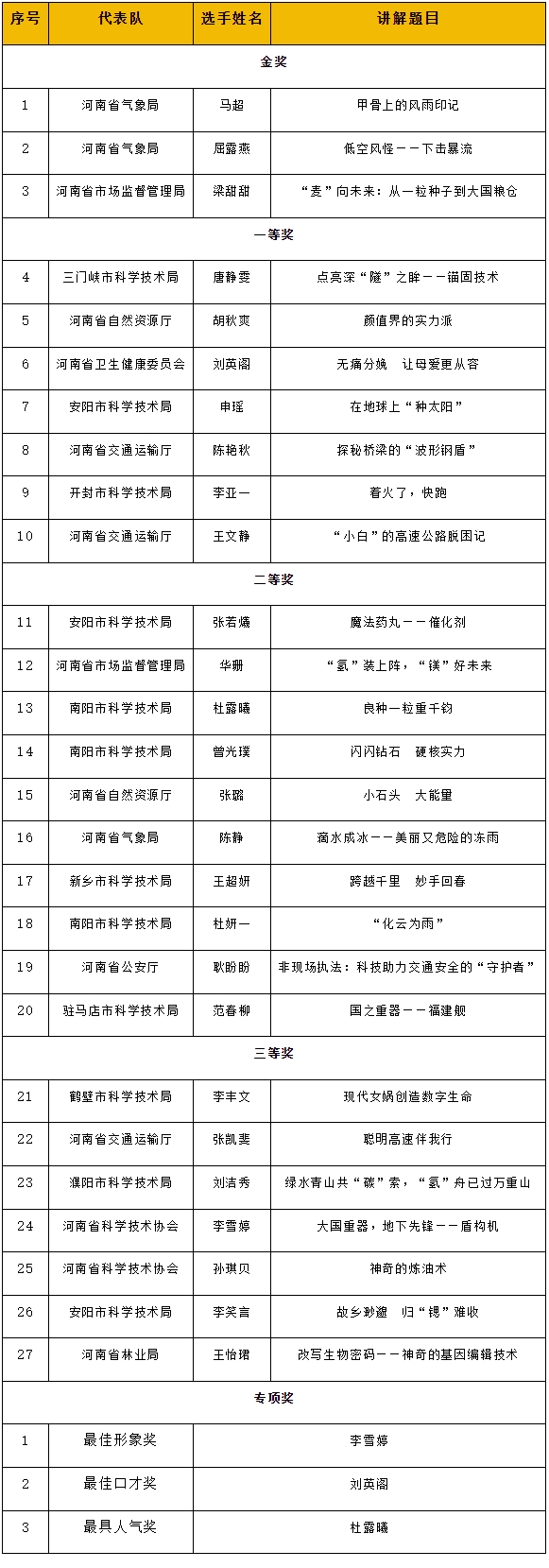 从“基因编辑技术”到“在地球上‘种太阳’”,从“闪闪钻石 硬核实力”到“地下先锋——盾构机”……进入决赛的选手们讲述科技知识,解释科学现象,弘扬科学家精神,在公众与科学之间搭起了科普的桥梁。经过激烈角逐,本次大赛共评选出金奖3名、一等奖7名、二等奖10名、三等奖7名以及专项奖3名,其中金奖获得者将被优先推荐代表我省参加全国科普讲解大赛。