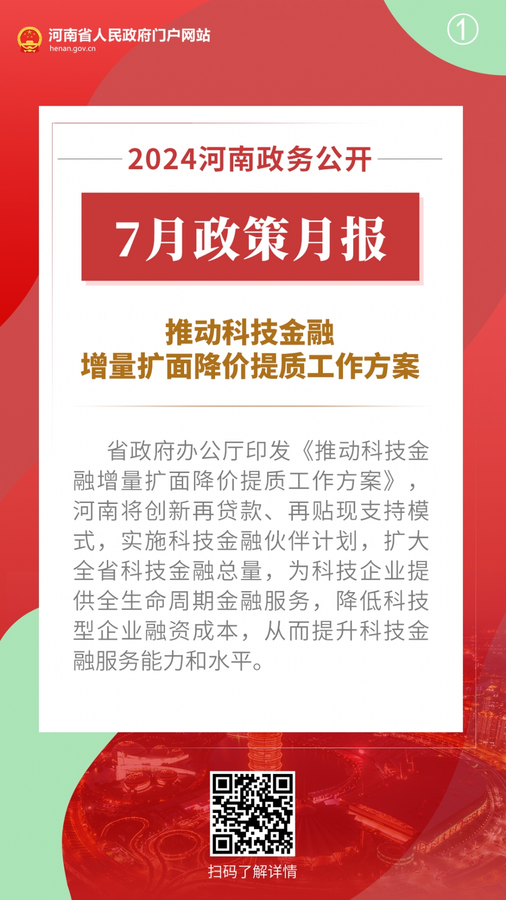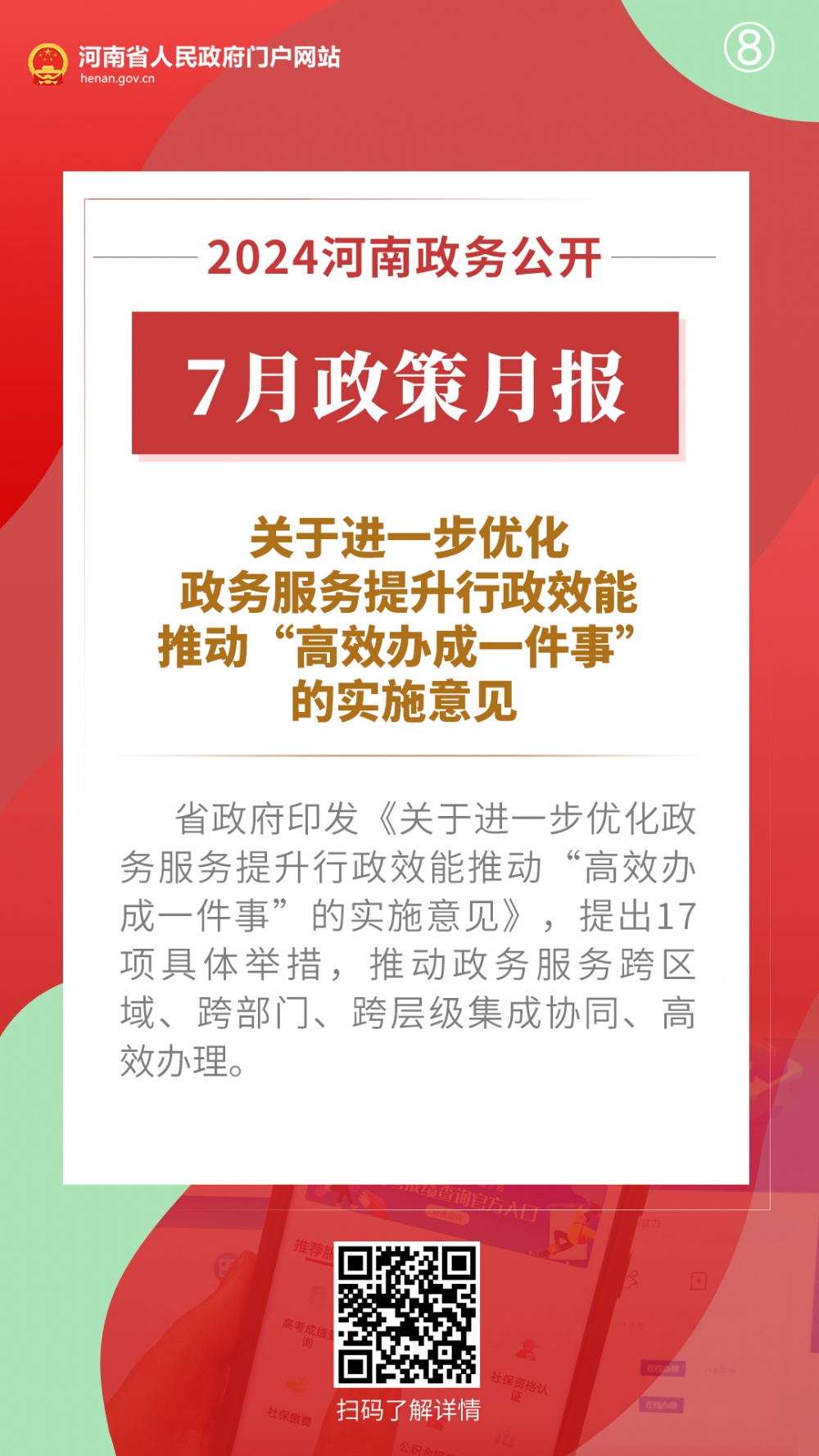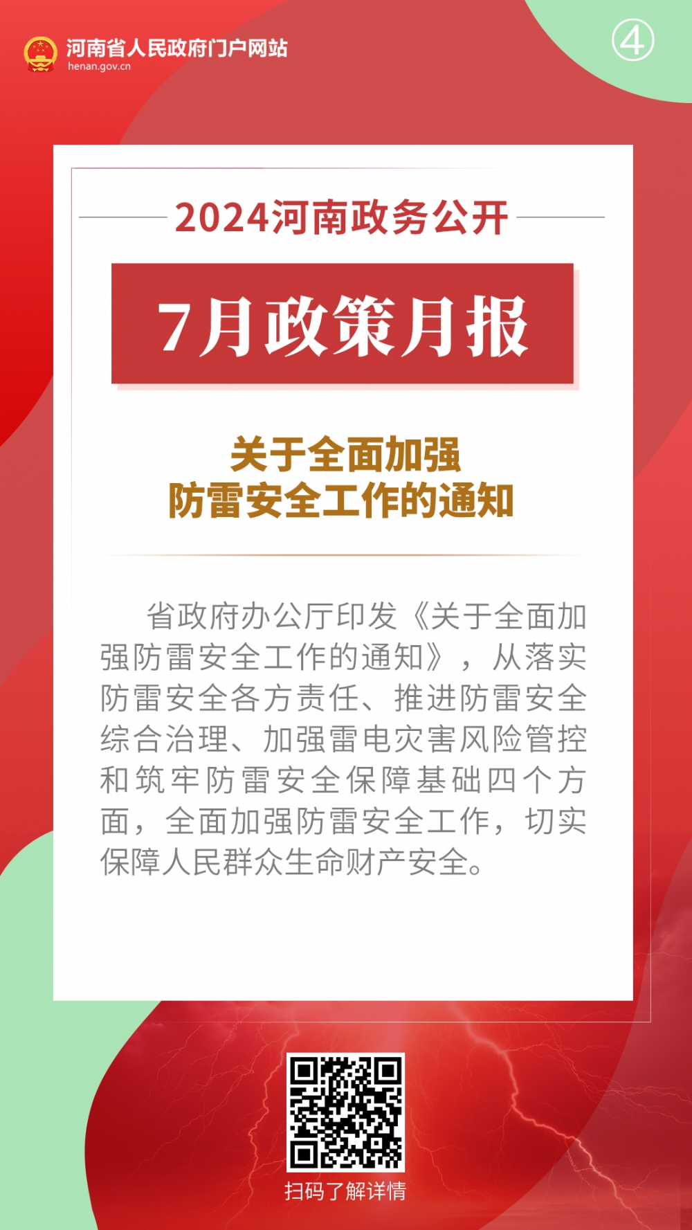 2024年7月,河南省人民政府出台多项重要政策,包括推动科技金融增量扩面降价提质工作方案、河南省保障农民工工资支付工作考核办法、推动科技型企业利用资本市场高质量发展工作方案、关于全面加强防雷安全工作的通知、河南省废弃物循环利用体系建设行动方案、河南省促进内外贸一体化发展若干措施、扎实推进2024年下半年经济稳进向好若干措施、关于进一步优化政务服务提升行政效能推动“高效办成一件事”的实施意见。通过河南政务公开7月政策月报,一起来看详情——