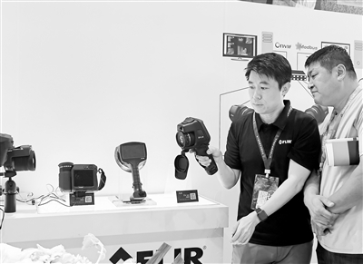 图为工作人员向观众介绍红外热成像预防煤场火灾仪器。