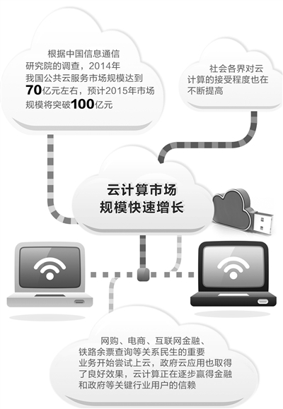 另一方面,各个产业对云计算的接受程度也在不断提高。根据中国信息通信研究院的调查,2014年我国公共云服务市场规模达到70亿元左右,增速达到47.5%,预计2015年市场规模将突破100亿元。