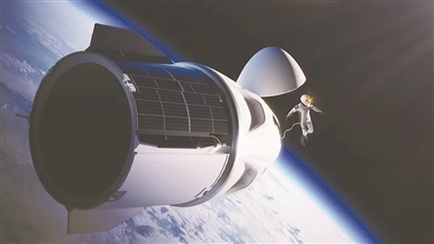 “北极星黎明”号艺术图显示,一名机组人员通过生命维持带漂浮在“龙”飞船太空舱外。本文图片来源:SpaceX