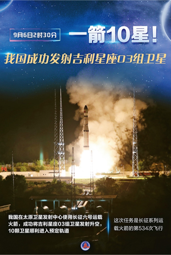 图为202496230分,我国在太原卫星发射中心使用长征六号运载火箭,成功将吉利星座03组卫星发射升空,10颗卫星顺利进入预定轨道,发射任务获得圆满成功。 新华社发 施鳗珂 安迪/编制