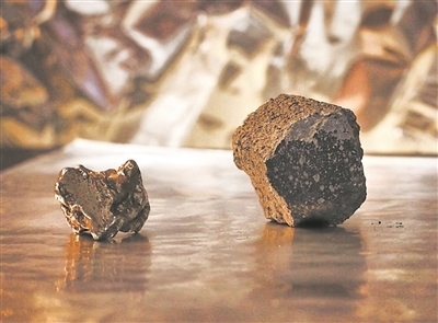 一颗来自熔融行星核心的铁陨石(左)和一颗来自原始未熔融行星的球粒陨石(右)。