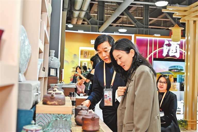 11月5日,参观者正在进博会河南人文交流展区观赏展品。河南日报社全媒体记者 马腾飞 摄