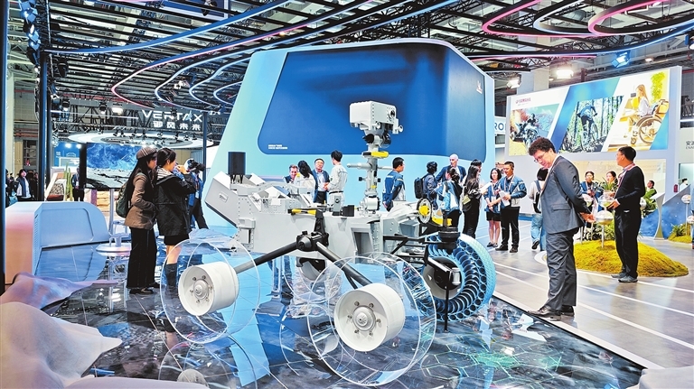11月6日,进博会上展出的月球探测车轮胎等高科技产品吸引众多参观者驻足。河南日报社全媒体记者 王磊彬 摄