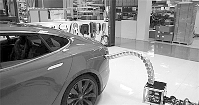 特斯拉这款自动充电机器人是一款蛇形机器人,采用了金属机身,当MODEL S与机器人接近时,汽车将会自动打开充电插口的舱盖,接着自动充电机器人会在30秒左右的时间中自动完成对接工作并开始充电。在此过程中,该系统会引导司机进行泊车。
