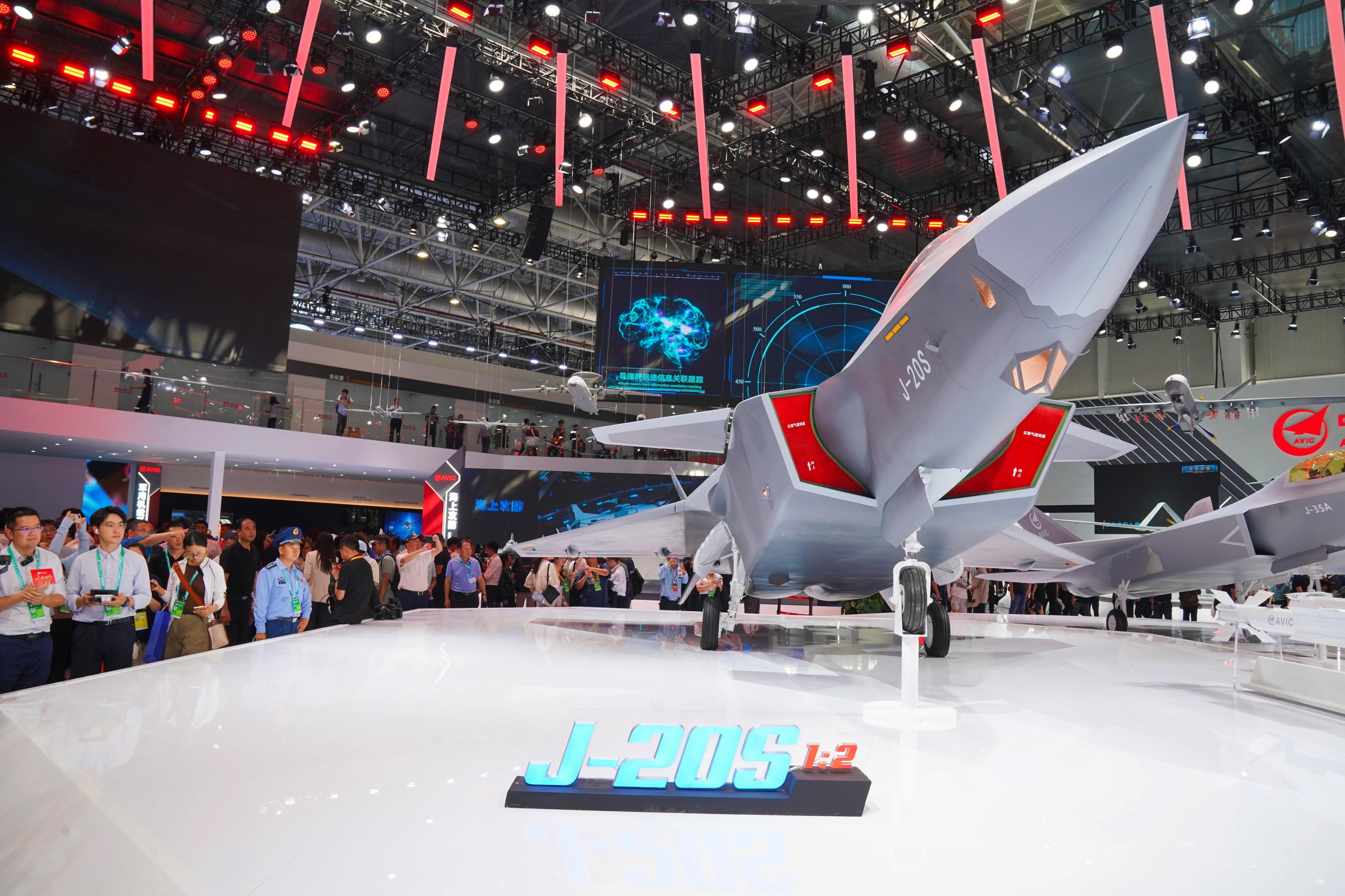 第十五届中国国际航空航天博览会11月12日在广东珠海开幕。航展首日,中国航空工业集团展馆内,我国自主研制的新一代中远程、重型、双座、多用途隐身战斗机歼-20S的缩比模型正式亮相。图为观众参观首次展出的歼-20S战机缩比模型。科技日报记者 都芃摄
