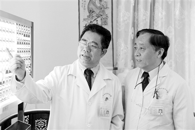 | 图为罗荣城教授(左一)与中心肿瘤专家王远东教授在讨论肿瘤典型病例 |