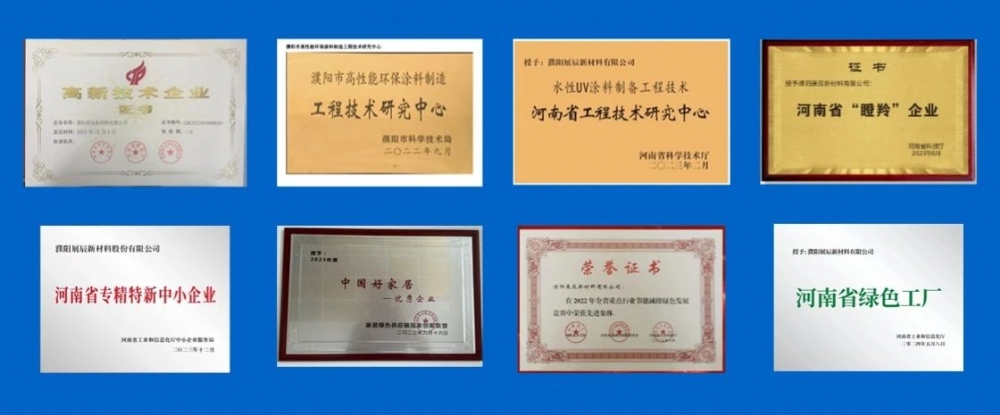 展辰新材料积极联合上下游企业开展技术合作、促进产业进步,与联邦家具打造了业内首条水性UV静电涂装线,联合湛新、金田豪迈、博硕、白玉兰家具共同开展水性及水性UV涂料技术创新,打造了全球首条以高光镜面水性UV为核心的产业链,推动了涂料产业绿色发展。荣获河南省“专精特新”中小企业、河南省“瞪羚企业”、河南省“绿色工厂”、河南省“质量诚信体系建设AAA级企业”、河南省“智能车间”等多项荣誉称号。