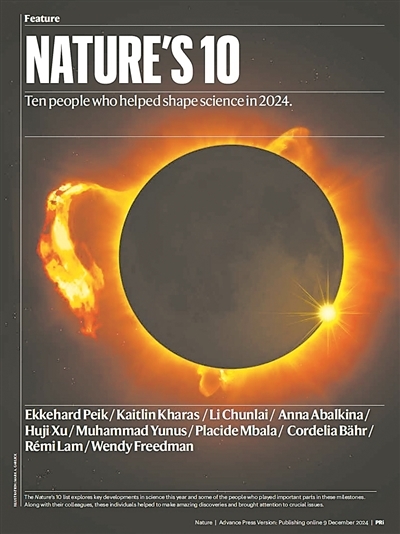 科技日报北京12月10日电 (记者张梦然)《自然》杂志10日发布了2024年十大(Nature's 10)科学人物。年度十大科学人物是《自然》从当年一些宏大科学故事的参与者中评选出的10个人。《自然》特写部编辑布兰登·马赫表示:“今年的十大科学人物对科学界和全世界产生了不容忽视的影响。”