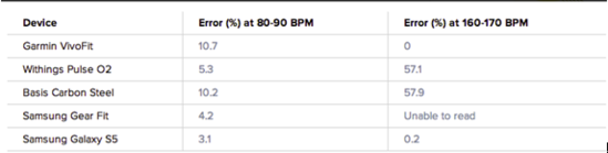 结果证明,在静止条件下,五款可穿戴设备的数据都比较精确,误差率控制在10%左右,但在运动状态中,除了Garmin VivoFit和Galaxy S5表现惊人外,其余几款设备都出现了较大程度的误差。