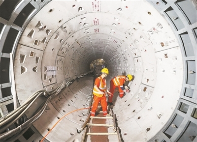 图为施工人员在广州海珠湾隧道6号联络通道内紧固隧道管片螺栓。新华社记者 刘大伟摄