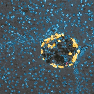 在禁食或运动期间,免疫细胞(红色)迁移至胰腺并刺激产生胰高血糖素的细胞(橙色)来调节血糖,其中细胞核以蓝色显示。图片来源:美国《科学》杂志