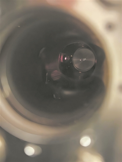 这是使用里德伯原子测量温度的实验室装置,其中发光的红色球体为该装置中使用的大约100万个铷原子组成的云团。