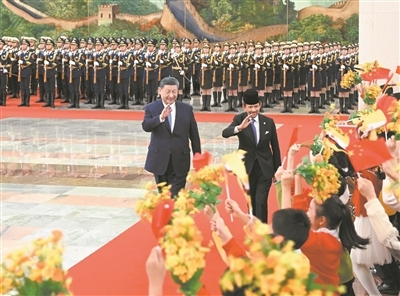 二月六日上午,国家主席习近平在北京人民大会堂同来华进行国事访问的文莱苏丹哈桑纳尔举行会谈。这是会谈前,习近平在人民大会堂北大厅为哈桑纳尔举行欢迎仪式。新华社记者 申宏摄