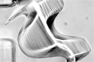 用“瞬态光学液体成型”3D打印技术打印出的长度约500微米的物件。