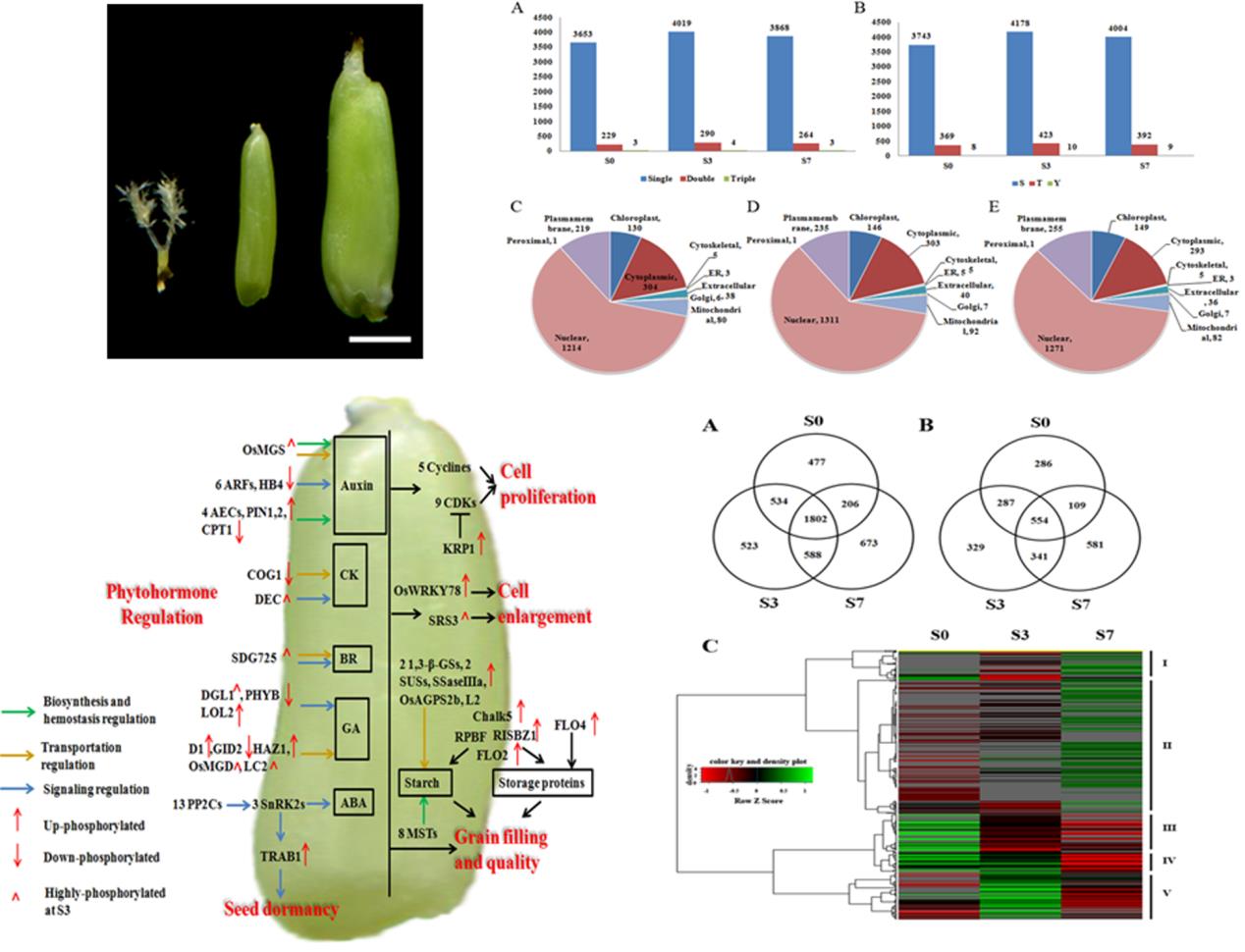 蛋白质翻译后修饰是重要的生物学调控机制。目前,已报道的蛋白质翻译后修饰多达300多种,其中蛋白质磷酸化存在最为广泛,研究最为深入。据悉,植物中超过三分之一的蛋白为磷酸化蛋白,其功能涉及到植物的生长、发育、抗逆、抗病等多个方面。虽然在拟南芥等模式植物中已有大量的研究,但水稻中磷酸化蛋白质的研究却相当滞后。目前已鉴定的水稻磷酸化蛋白仅有3000-4000个,且大部分功能未知。该研究成果不但表明磷酸化可能是翻译后蛋白质行使生物学功能的重要调控开关,增进了对水稻种子发育过程的磷酸化调控机制的了解,也为进一步研究这些磷酸化蛋白质的功能指明了方向。