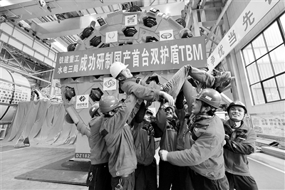 2015年12月24日,中国铁建重工集团联合水电三局、黄河设计院等共同研发、具有完全自主知识产权的首台双护盾硬岩全断面隧道掘进机(TBM)研制成功,并在长沙下线,填补了我国双护盾硬岩TBM研制的空白。双护盾硬岩TBM是全断面岩石掘进机的一种,它借鉴和集成了敞开式TBM和盾构机的技术特点,特别适用于围岩破碎、稳定性差的岩层条件。该机型具备敞开式、单护盾式和双护盾式三种掘进模式,能根据地质情况、施工进度灵活选用不同的掘进模式,尤其在双护盾模式下,其配置的两套推进系统交替工作,可实现TBM不间断连续掘进,掘进速度较高。图为铁建重工员工庆祝国产首台双护盾TBM研制成功。