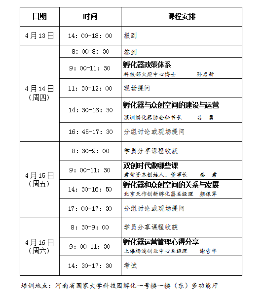 为贯彻落实国家科技部《关于开展科技企业孵化器从业人员培训工作的通知》(国科火字〔2012〕108号)精神,推进“大众创业、万众创新”,进一步提升科技企业孵化器从业人员业务水平与服务能力,根据国科火字〔2013〕150号文件,河南省国家大学科技园作为科技部火炬中心确定的我省唯一一家国家级孵化器从业人员培训机构,受科技部火炬中心委托,河南省国家大学科技园于4月13日-15日举办2016年第一期(总第五期)河南省科技企业孵化器从业人员培训班。实施方案如下: